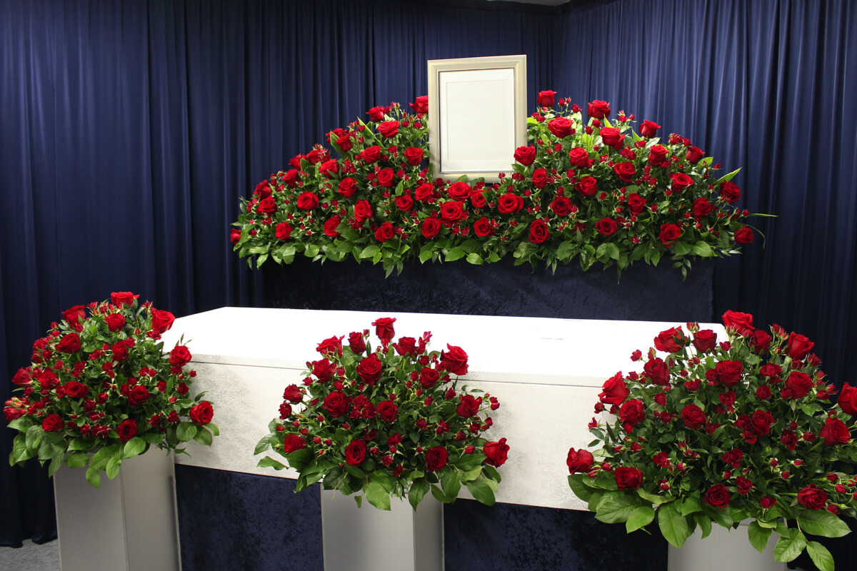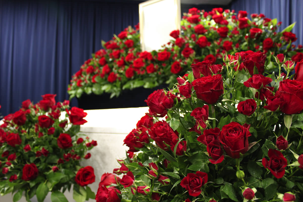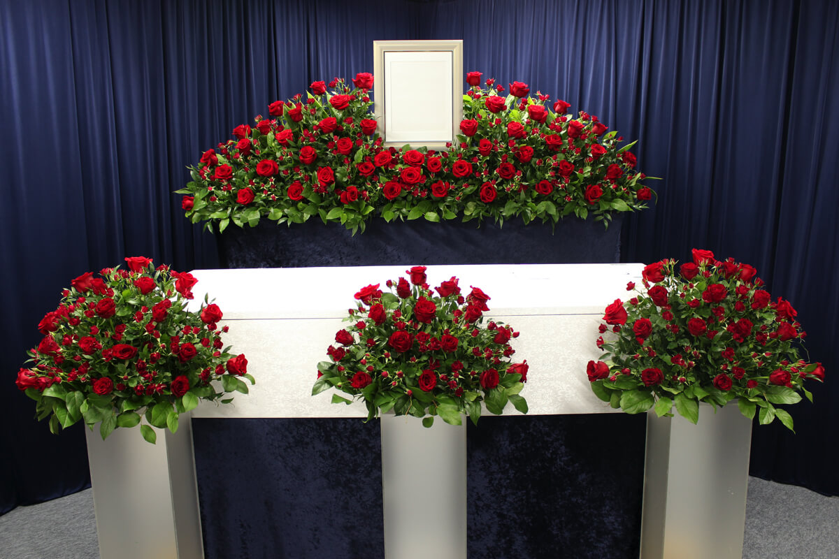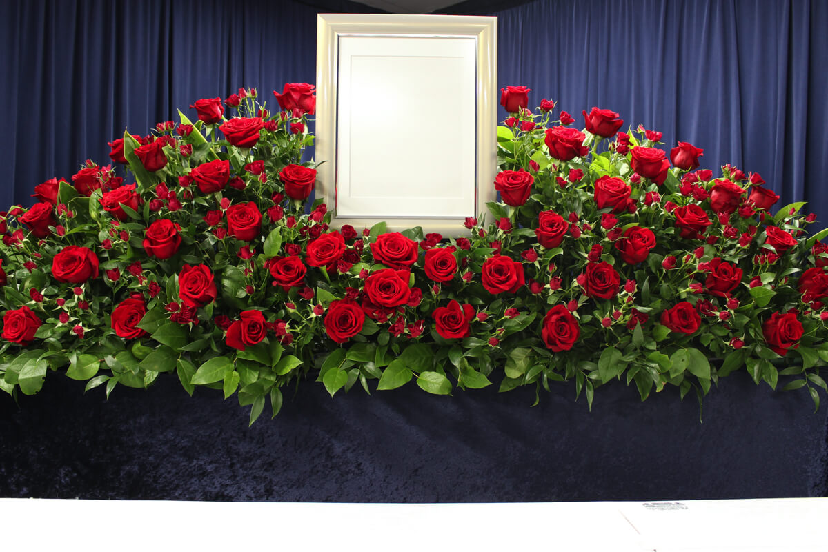 情熱的な赤いバラをはじけるようにデザインした生花祭壇です。 赤と緑のコントラストが美しく、バラの美しさが目を引きます。 アレンジを動かすことができるのでお飾りするスペースに合わせて柔軟に対応することができます。