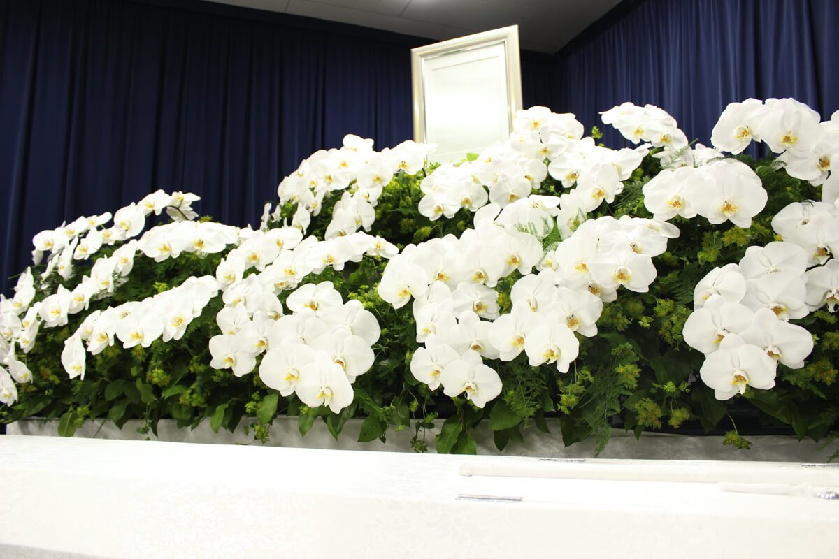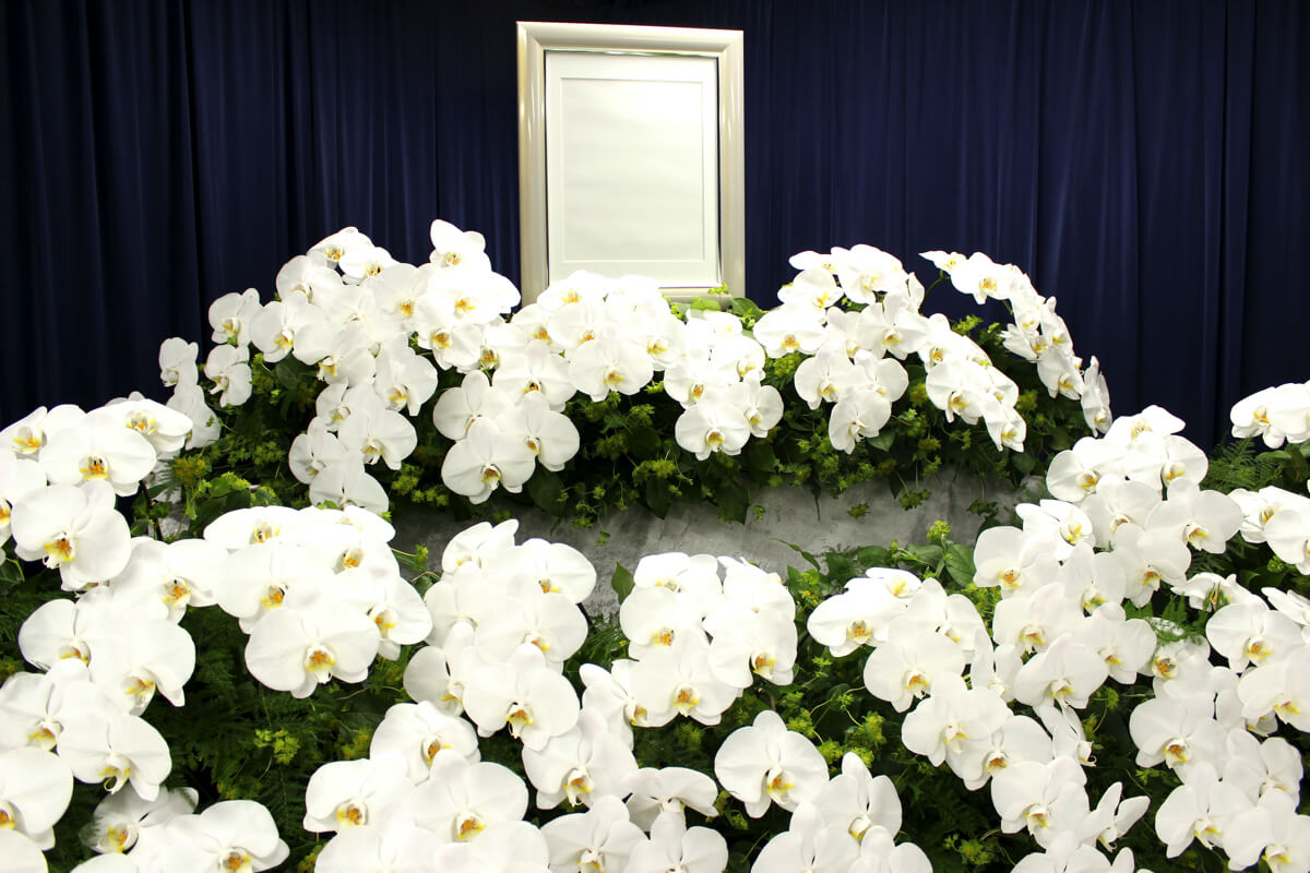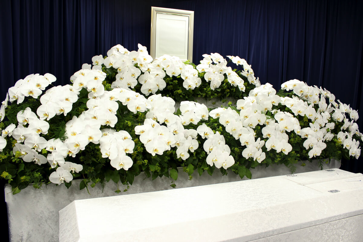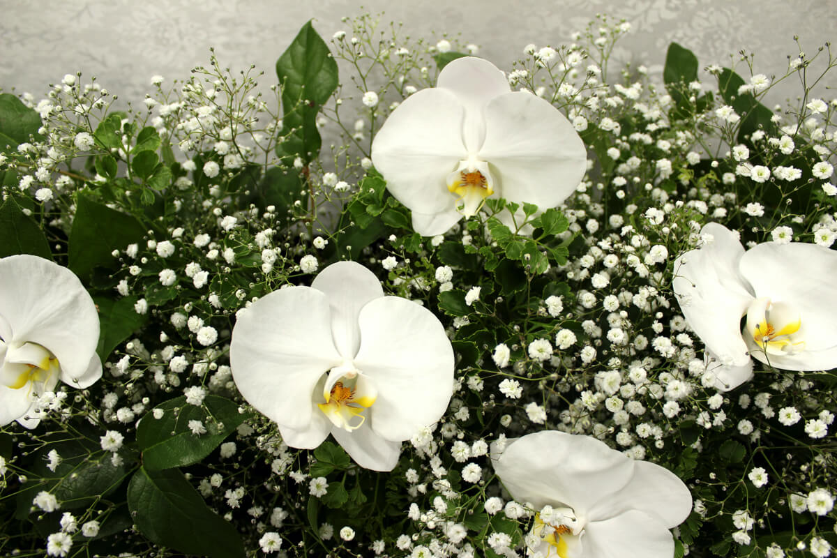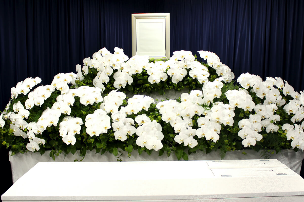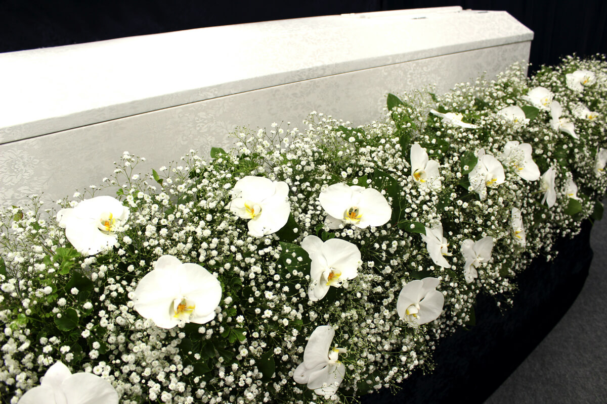 高貴で清楚な雰囲気をもつコチョウランのみで仕上げた生花祭壇です。 蝶が舞うような姿から胡蝶蘭と名付けられ、「幸福が飛んでくる」という花言葉を持っています。 コチョウランの魅力を最大限に引き出すため、葉物のみ使用しコントラストを際立たせました。
