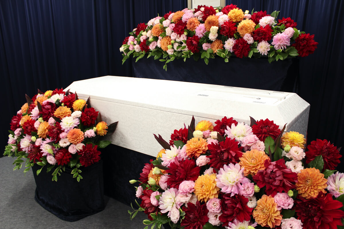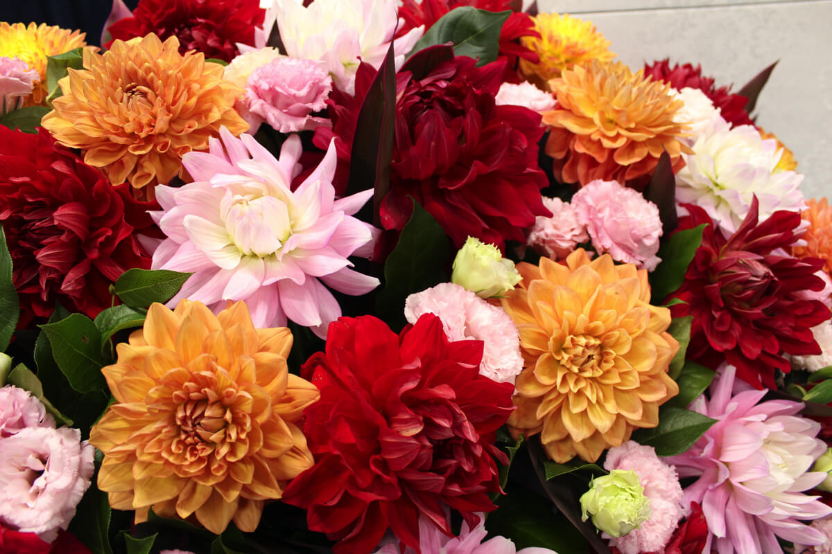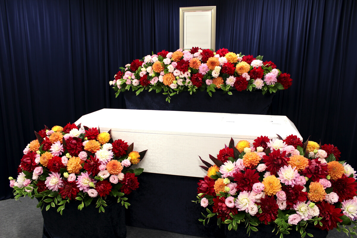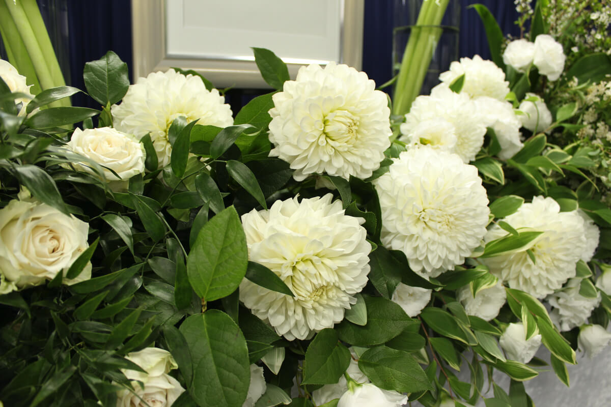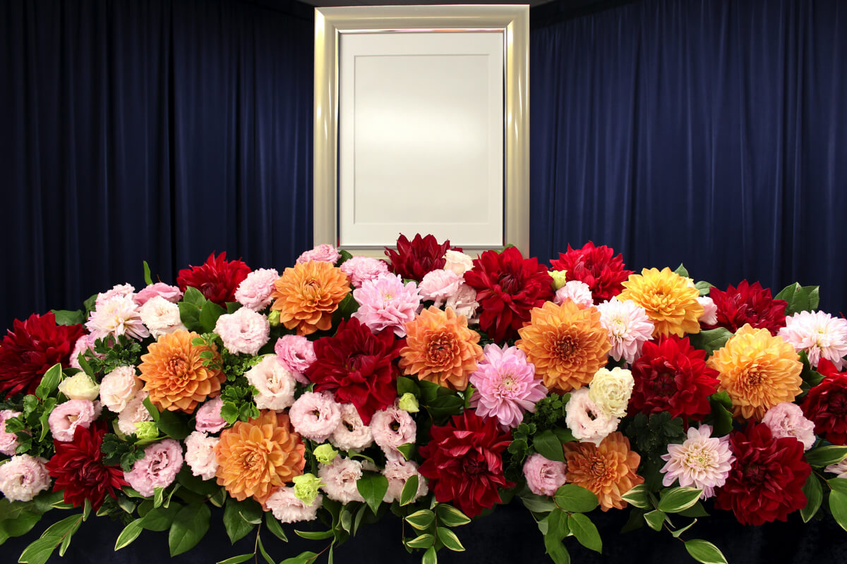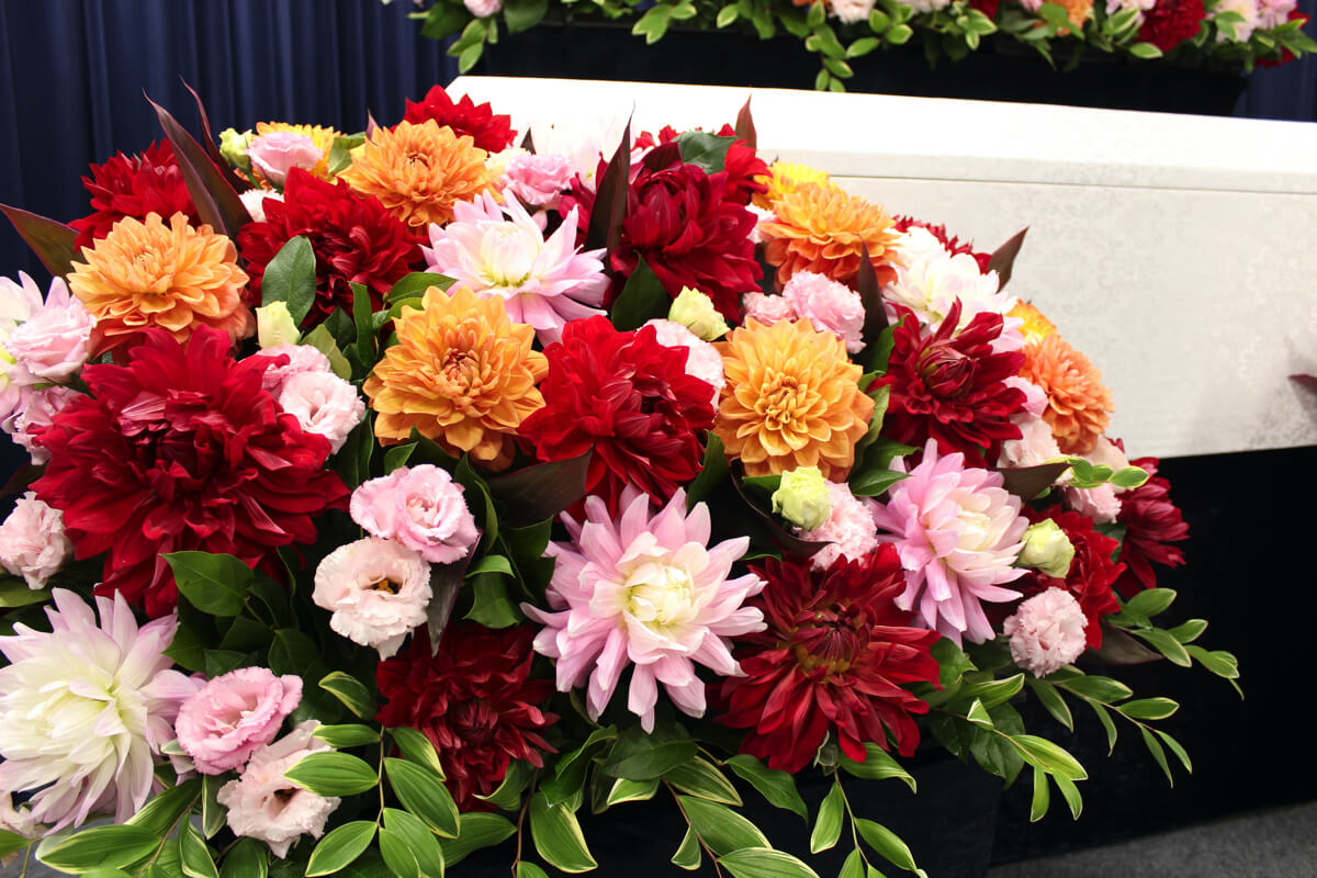 輝くような大輪のダリアの魅力を全面に描き出した祭壇です。 古くから親しまれてきたダリアは豪華で力強く、花色が豊富で存在感があります。 生花祭壇のなかでもボリュームのある花のひとつです。