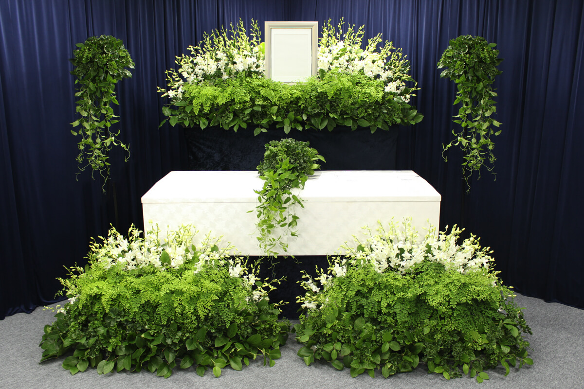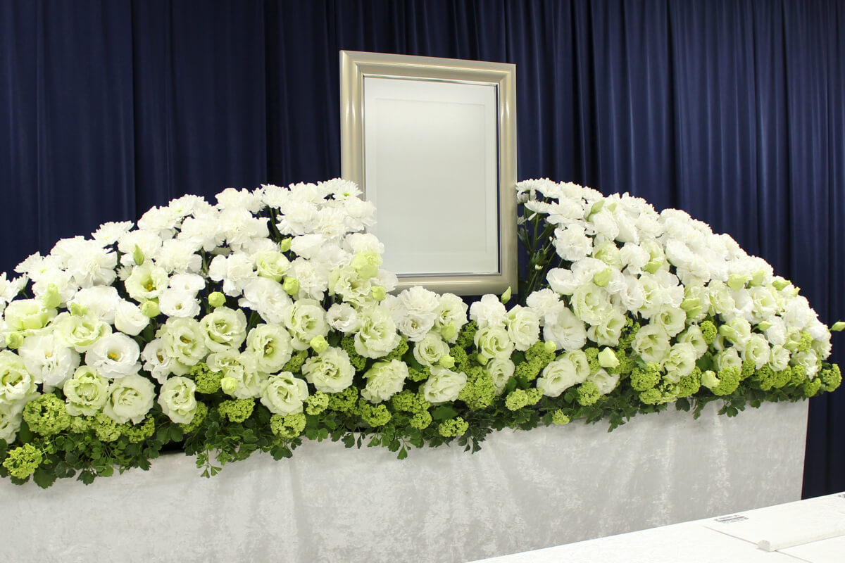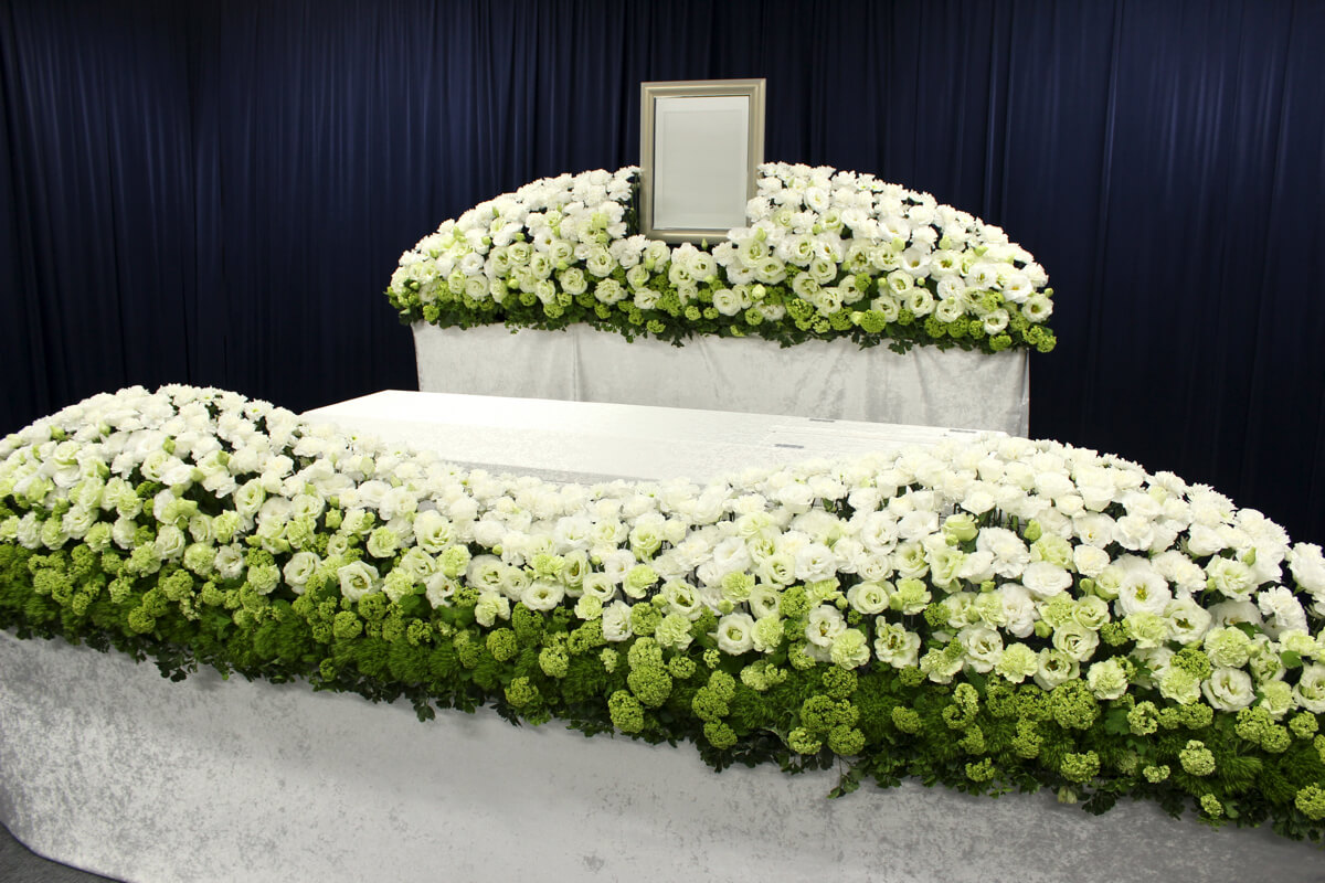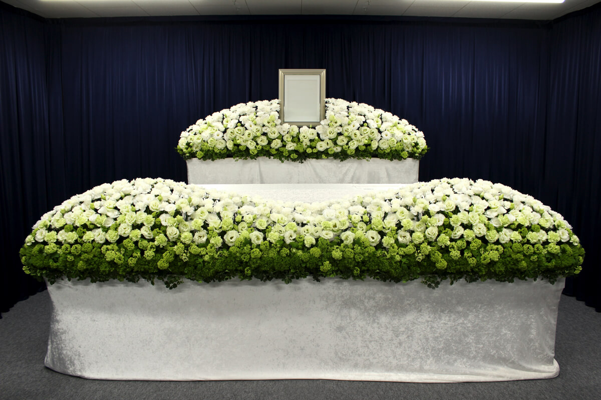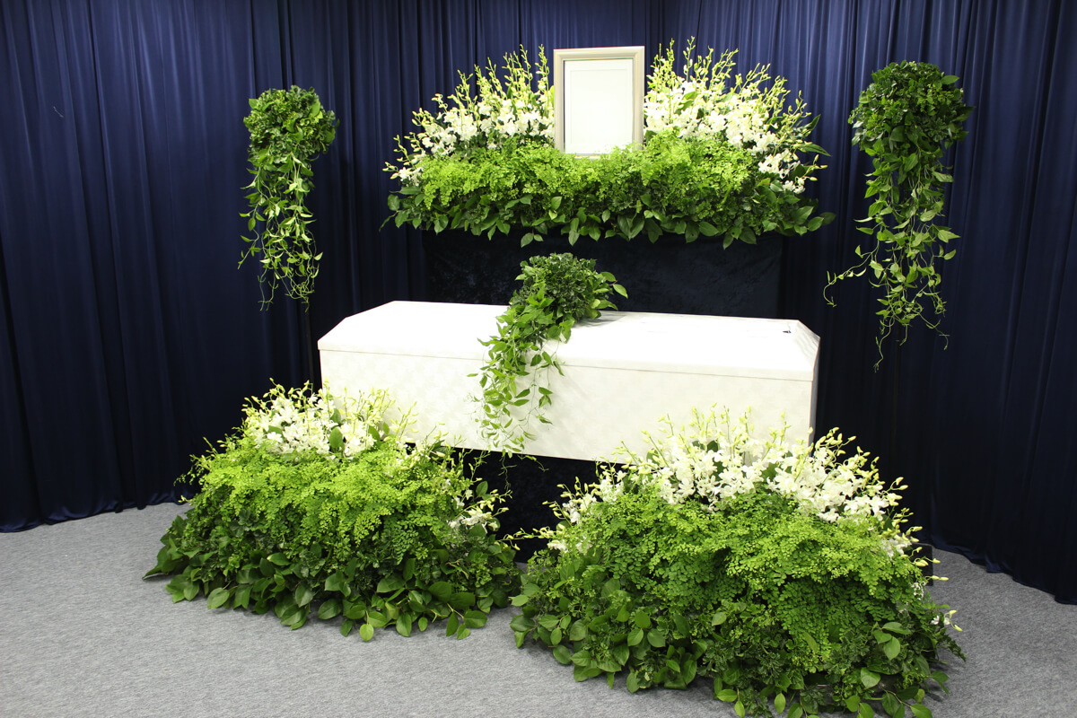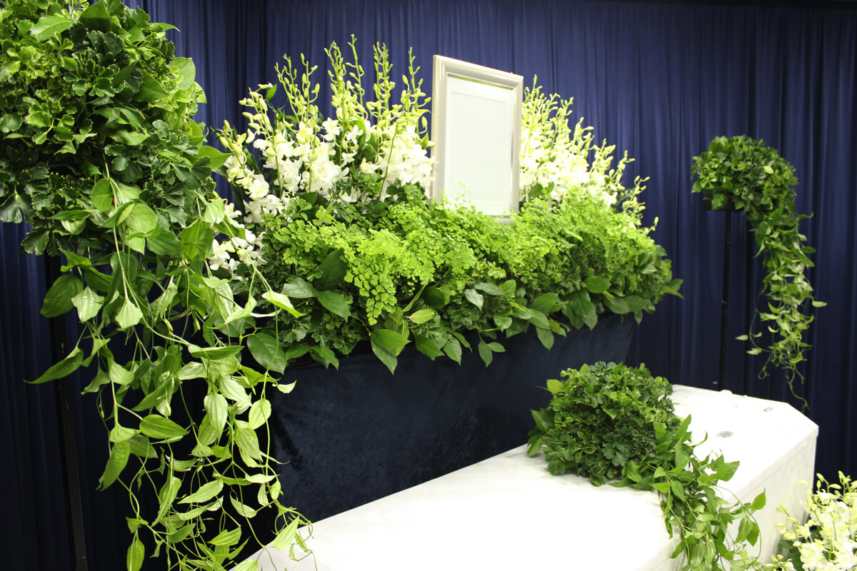 清々しい白と緑のグラデーションで棺をはさんだ形の祭壇です。 オーソドックスな生花祭壇の形のなかに色彩のコントラストを表現しました。 たおやかな静けさの中にどこか上品さが感じられる祭壇です。