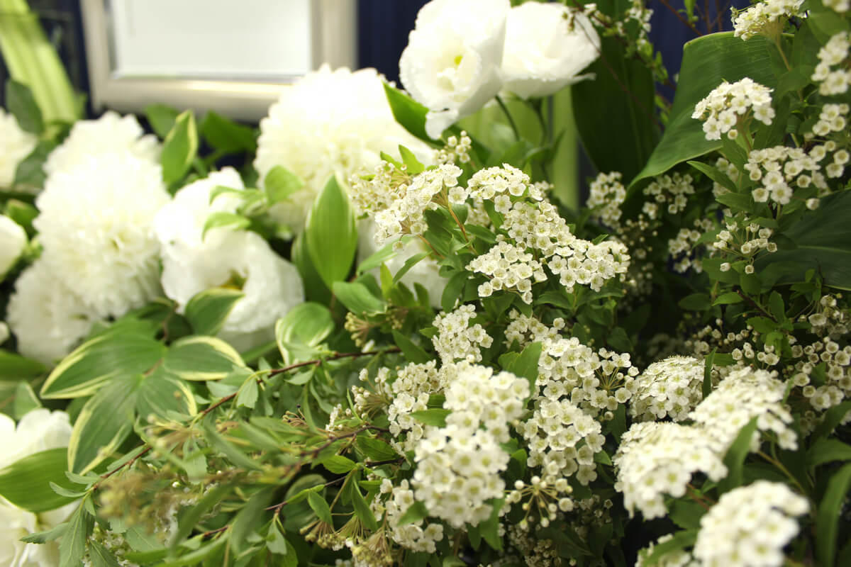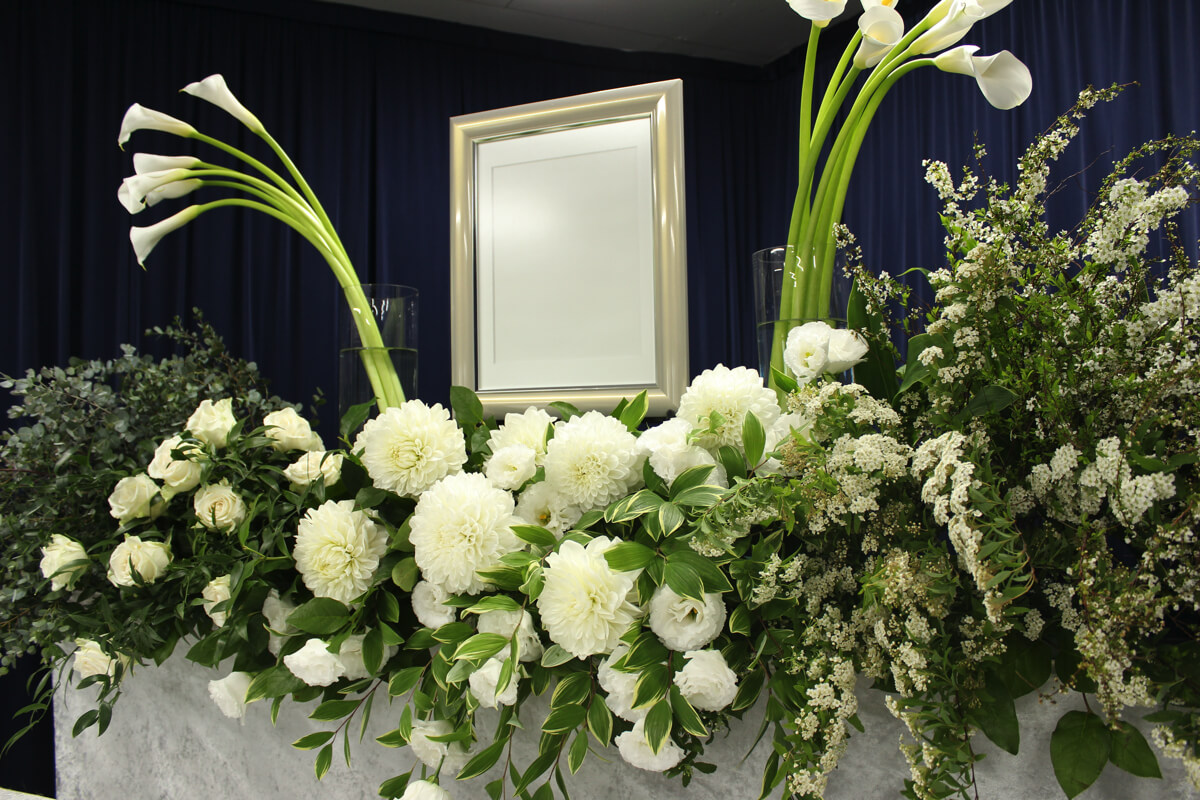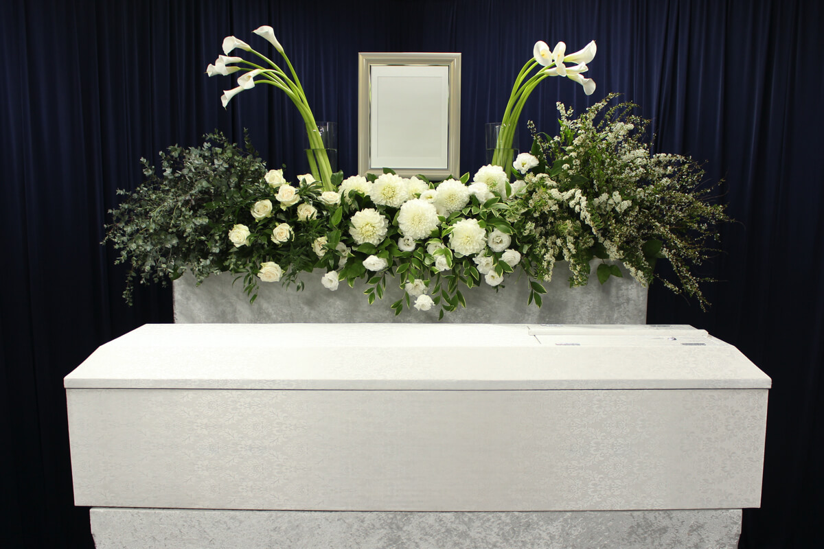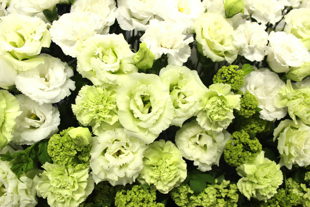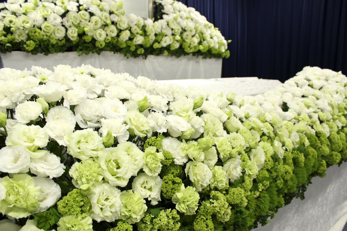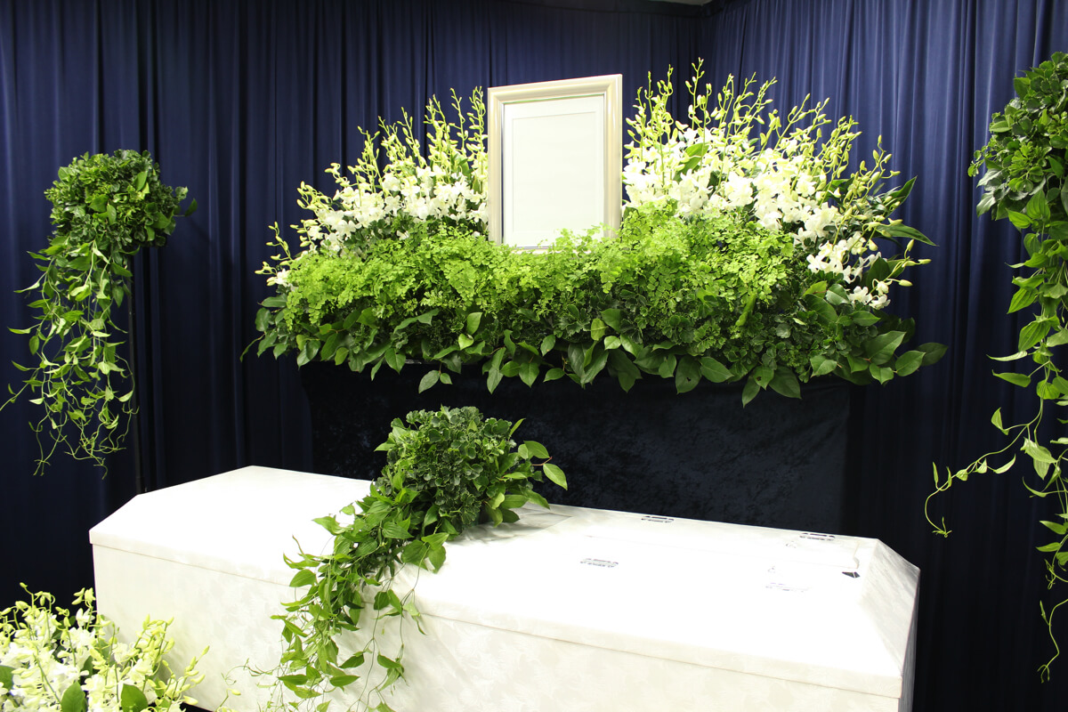 清々しい白と緑のグラデーションで棺をはさんだ形の祭壇です。 オーソドックスな生花祭壇の形のなかに色彩のコントラストを表現しました。 たおやかな静けさの中にどこか上品さが感じられる祭壇です。