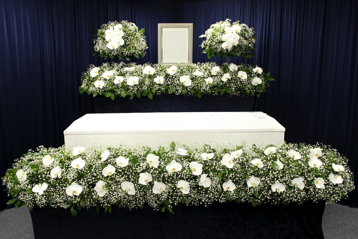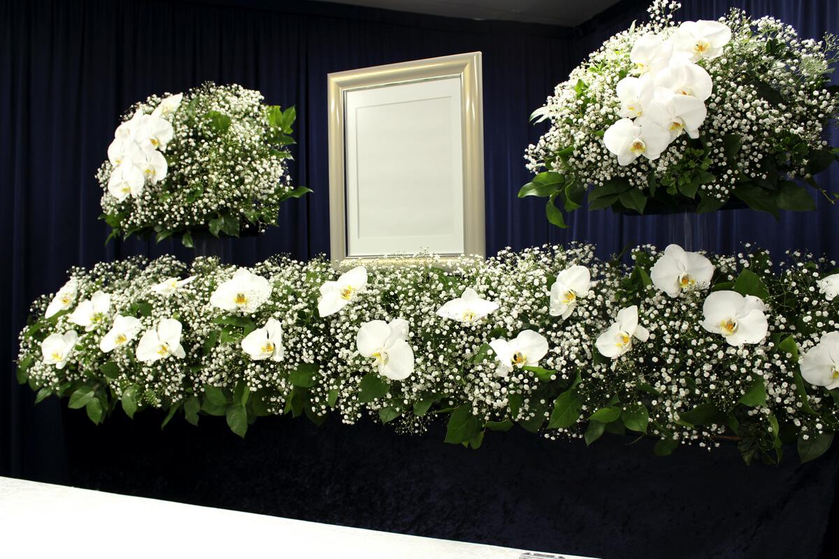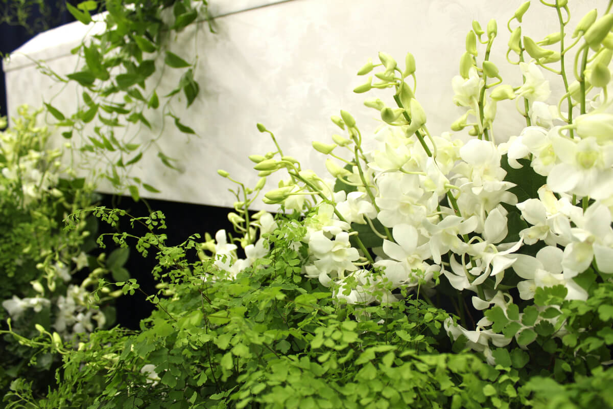色花を一切使用せずデンファレとグリーンのみで仕上げた生花祭壇です。 「生花祭壇にしたいけれどイメージがちがうかなぁ」とのお声をいただきデザインしました。 オリエンタルな雰囲気でありながらどこか知的なイメージも兼ね備えています。