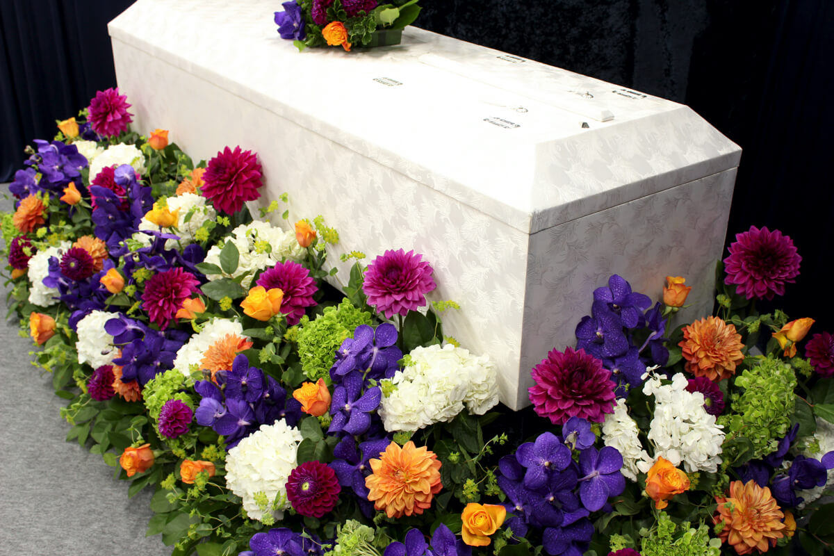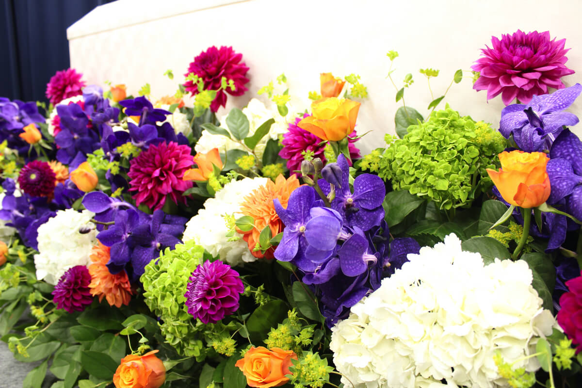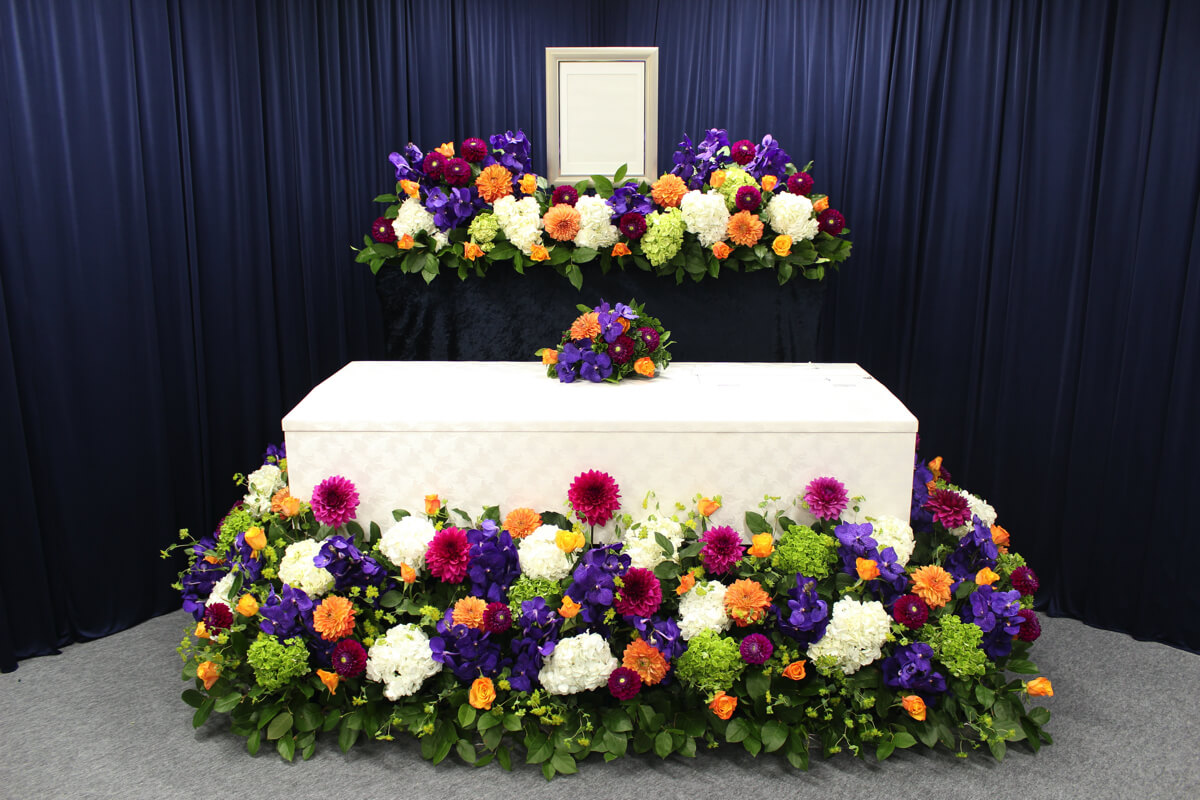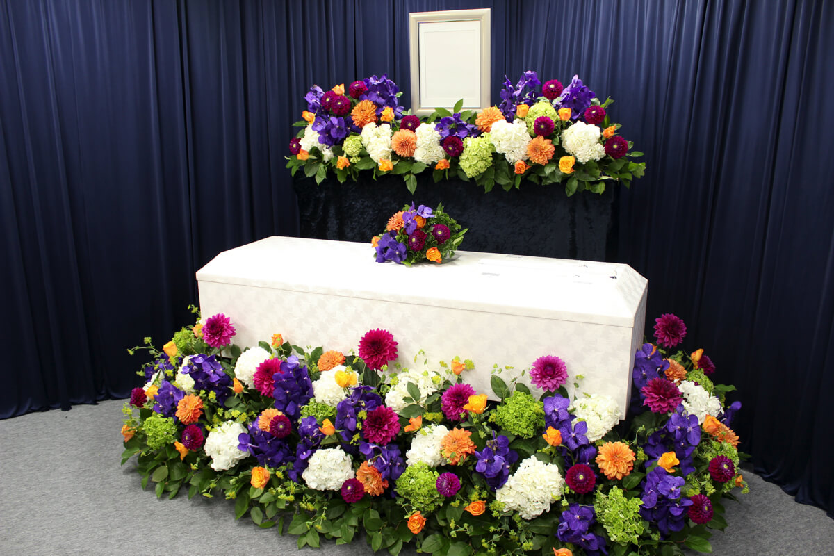 エキゾチックな色使いで、上品ながらもインパクトのあるお花を使用した祭壇です。 お棺を三方からたくさんのお花で囲み、さみしくならないように華やかに仕上げました。 コンパクトな仕上がりにしたため、家族葬や自宅葬でもお飾りいただけます。