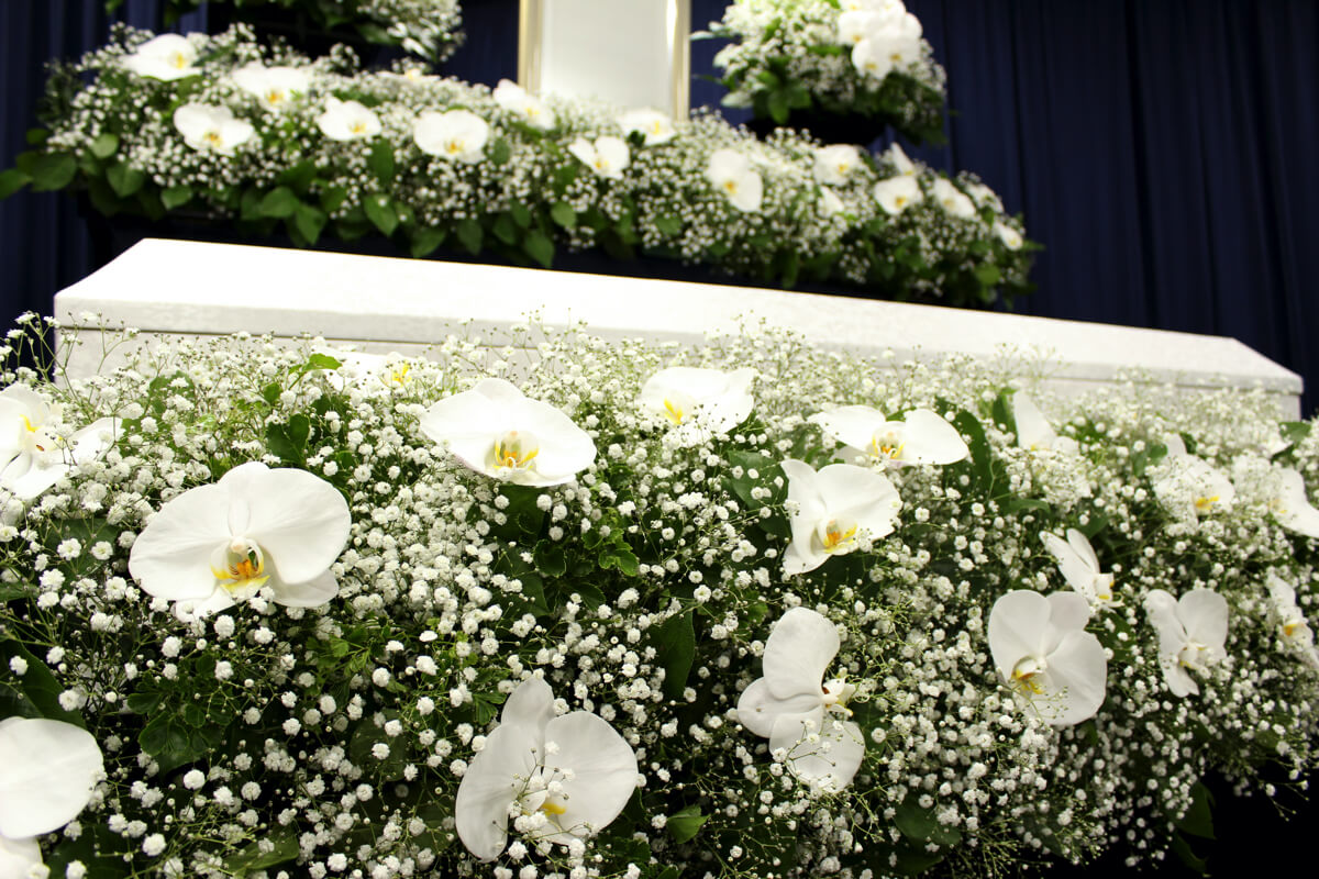 カスミソウをふんだんに使用し、やさしいふんわりとしたイメージの祭壇です。 コチョウランの輪を所々にあしらいアクセントをつけました。 お好みでカスミソウのみで仕上げることも可能です。