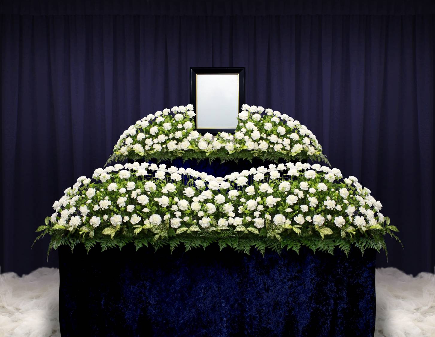 「純粋な愛」という意味を持った白いカーネーションをふんだんに使用した生花祭壇です。