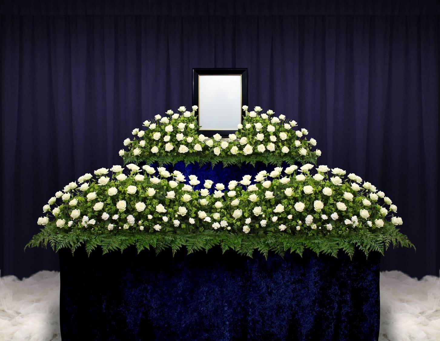 「深い尊敬」という意味を持った白いバラをふんだんに使用した生花祭壇です。